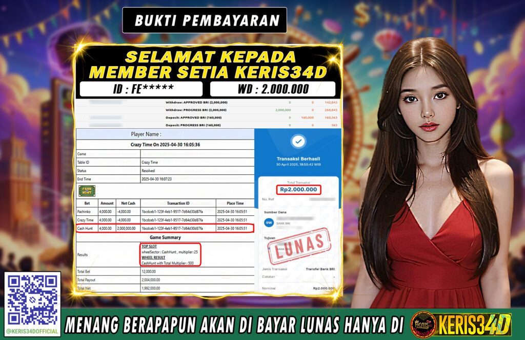 KERIS34D dikenal sebagai situs terpercaya yang selalu menghadirkan pengalaman bermain slot online yang aman, fair, dan berlisensi resmi. Di sini, kami tidak hanya sekadar memberikan janji, tapi bukti nyata berupa slip kemenangan yang dapat Anda lihat secara langsung.