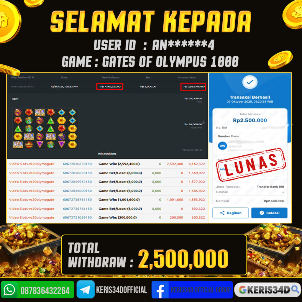 Setiap hari, member KERIS34D berhasil meraih jackpot besar dari berbagai provider slot ternama yang kami sediakan, seperti Pragmatic Play, Habanero, PG Soft, dan masih banyak lagi. Kami secara rutin menampilkan bukti screenshot atau rekapan kemenangan yang berhasil diraih, mulai dari kemenangan ratusan ribu hingga puluhan juta rupiah. Semua slip kemenangan ini kami hadirkan untuk membuktikan bahwa di KERIS34D, peluang menang itu nyata
