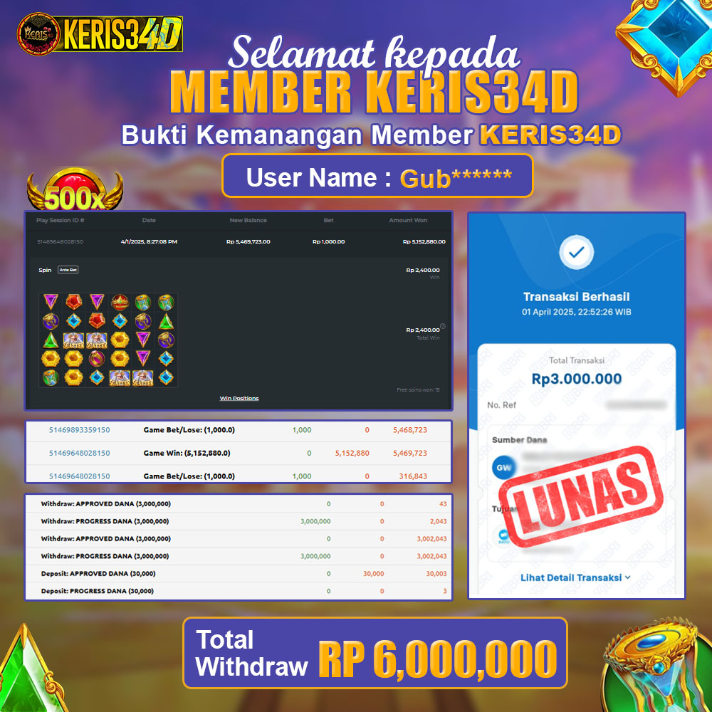 Setiap hari, member KERIS34D berhasil meraih jackpot besar dari berbagai provider slot ternama yang kami sediakan, seperti Pragmatic Play, Habanero, PG Soft, dan masih banyak lagi. Kami secara rutin menampilkan bukti screenshot atau rekapan kemenangan yang berhasil diraih, mulai dari kemenangan ratusan ribu hingga puluhan juta rupiah. Semua slip kemenangan ini kami hadirkan untuk membuktikan bahwa di KERIS34D, peluang menang itu nyata