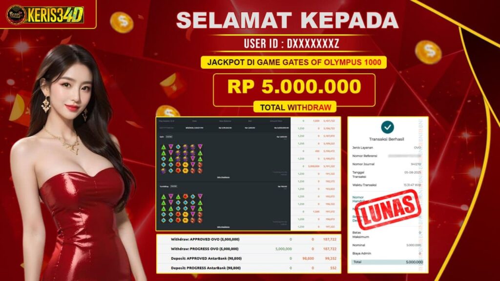 KERIS34D dikenal sebagai situs terpercaya yang selalu menghadirkan pengalaman bermain slot online yang aman, fair, dan berlisensi resmi. Di sini, kami tidak hanya sekadar memberikan janji, tapi bukti nyata berupa slip kemenangan yang dapat Anda lihat secara langsung.