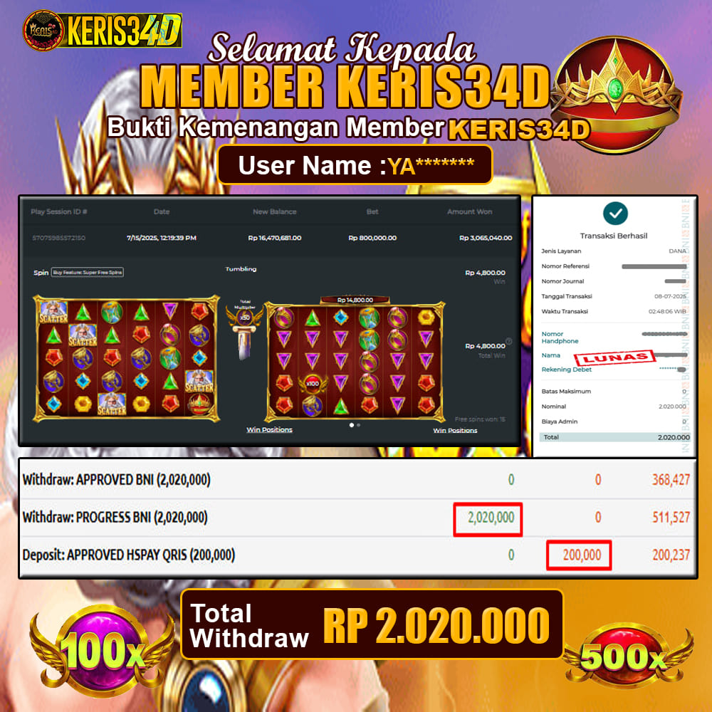 Setiap hari, member KERIS34D berhasil meraih jackpot besar dari berbagai provider slot ternama yang kami sediakan, seperti Pragmatic Play, Habanero, PG Soft, dan masih banyak lagi. Kami secara rutin menampilkan bukti screenshot atau rekapan kemenangan yang berhasil diraih, mulai dari kemenangan ratusan ribu hingga puluhan juta rupiah. Semua slip kemenangan ini kami hadirkan untuk membuktikan bahwa di KERIS34D, peluang menang itu nyata