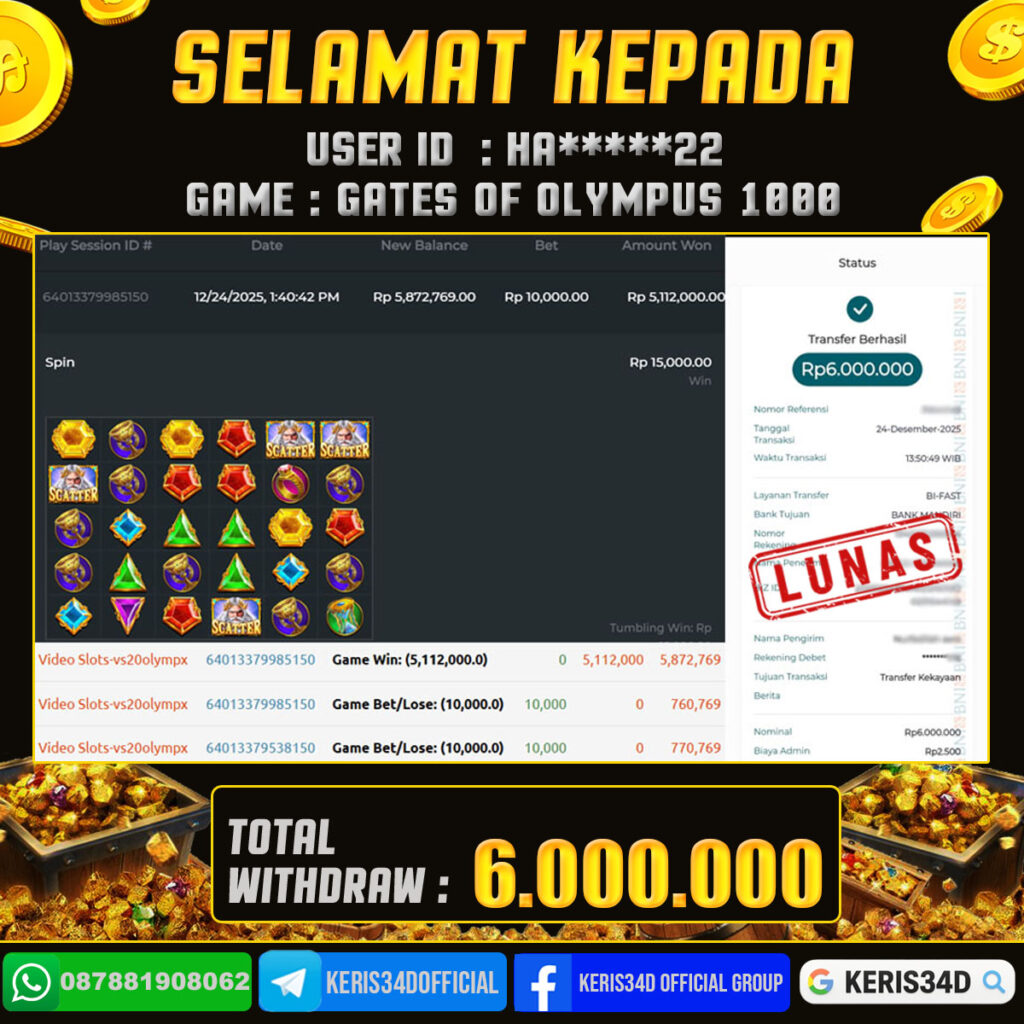 Setiap hari, member KERIS34D berhasil meraih jackpot besar dari berbagai provider slot ternama yang kami sediakan, seperti Pragmatic Play, Habanero, PG Soft, dan masih banyak lagi. Kami secara rutin menampilkan bukti screenshot atau rekapan kemenangan yang berhasil diraih, mulai dari kemenangan ratusan ribu hingga puluhan juta rupiah. Semua slip kemenangan ini kami hadirkan untuk membuktikan bahwa di KERIS34D, peluang menang itu nyata
