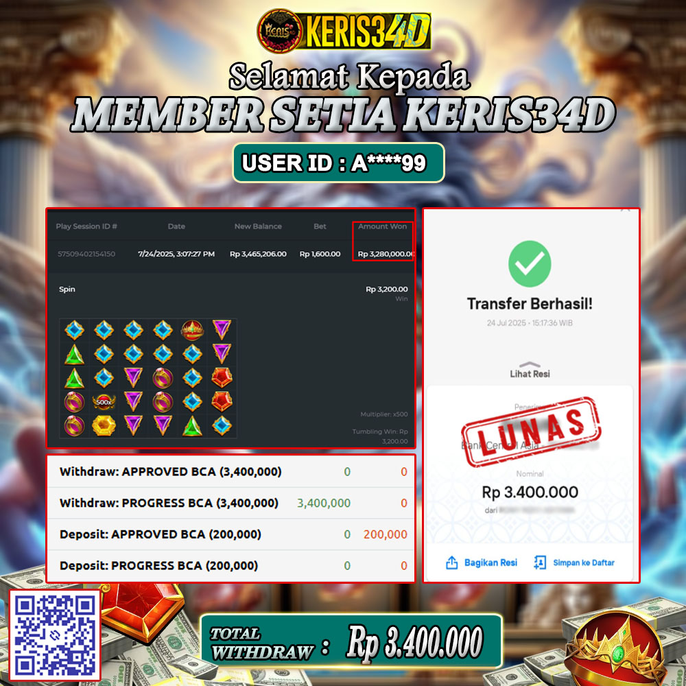 Setiap hari, member KERIS34D berhasil meraih jackpot besar dari berbagai provider slot ternama yang kami sediakan, seperti Pragmatic Play, Habanero, PG Soft, dan masih banyak lagi. Kami secara rutin menampilkan bukti screenshot atau rekapan kemenangan yang berhasil diraih, mulai dari kemenangan ratusan ribu hingga puluhan juta rupiah. Semua slip kemenangan ini kami hadirkan untuk membuktikan bahwa di KERIS34D, peluang menang itu nyata