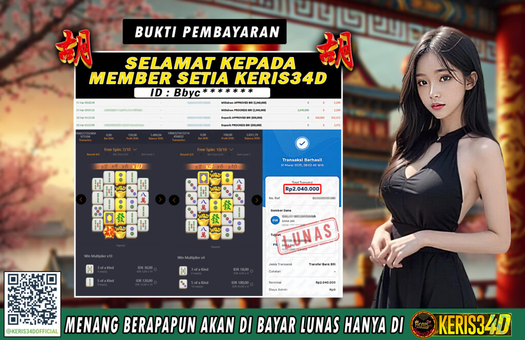 KERIS34D dikenal sebagai situs terpercaya yang selalu menghadirkan pengalaman bermain slot online yang aman, fair, dan berlisensi resmi. Di sini, kami tidak hanya sekadar memberikan janji, tapi bukti nyata berupa slip kemenangan yang dapat Anda lihat secara langsung.
