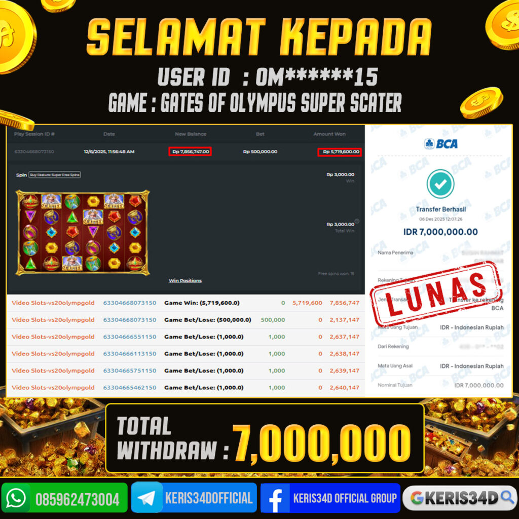Setiap hari, member KERIS34D berhasil meraih jackpot besar dari berbagai provider slot ternama yang kami sediakan, seperti Pragmatic Play, Habanero, PG Soft, dan masih banyak lagi. Kami secara rutin menampilkan bukti screenshot atau rekapan kemenangan yang berhasil diraih, mulai dari kemenangan ratusan ribu hingga puluhan juta rupiah. Semua slip kemenangan ini kami hadirkan untuk membuktikan bahwa di KERIS34D, peluang menang itu nyata