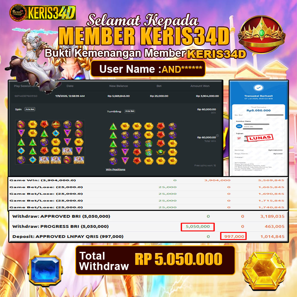 Setiap hari, member KERIS34D berhasil meraih jackpot besar dari berbagai provider slot ternama yang kami sediakan, seperti Pragmatic Play, Habanero, PG Soft, dan masih banyak lagi. Kami secara rutin menampilkan bukti screenshot atau rekapan kemenangan yang berhasil diraih, mulai dari kemenangan ratusan ribu hingga puluhan juta rupiah. Semua slip kemenangan ini kami hadirkan untuk membuktikan bahwa di KERIS34D peluang menang itu nyata