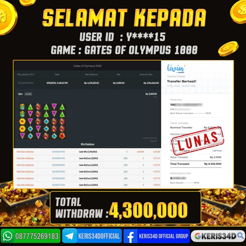 Setiap hari, member KERIS34D berhasil meraih jackpot besar dari berbagai provider slot ternama yang kami sediakan, seperti Pragmatic Play, Habanero, PG Soft, dan masih banyak lagi. Kami secara rutin menampilkan bukti screenshot atau rekapan kemenangan yang berhasil diraih, mulai dari kemenangan ratusan ribu hingga puluhan juta rupiah. Semua slip kemenangan ini kami hadirkan untuk membuktikan bahwa di KERIS34D, peluang menang itu nyata