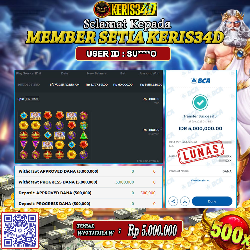 SSetiap hari, member KERIS34D berhasil meraih jackpot besar dari berbagai provider slot ternama yang kami sediakan, seperti Pragmatic Play, Habanero, PG Soft, dan masih banyak lagi. Kami secara rutin menampilkan bukti screenshot atau rekapan kemenangan yang berhasil diraih, mulai dari kemenangan ratusan ribu hingga puluhan juta rupiah. Semua slip kemenangan ini kami hadirkan untuk membuktikan bahwa di KERIS34D peluang menang itu nyata