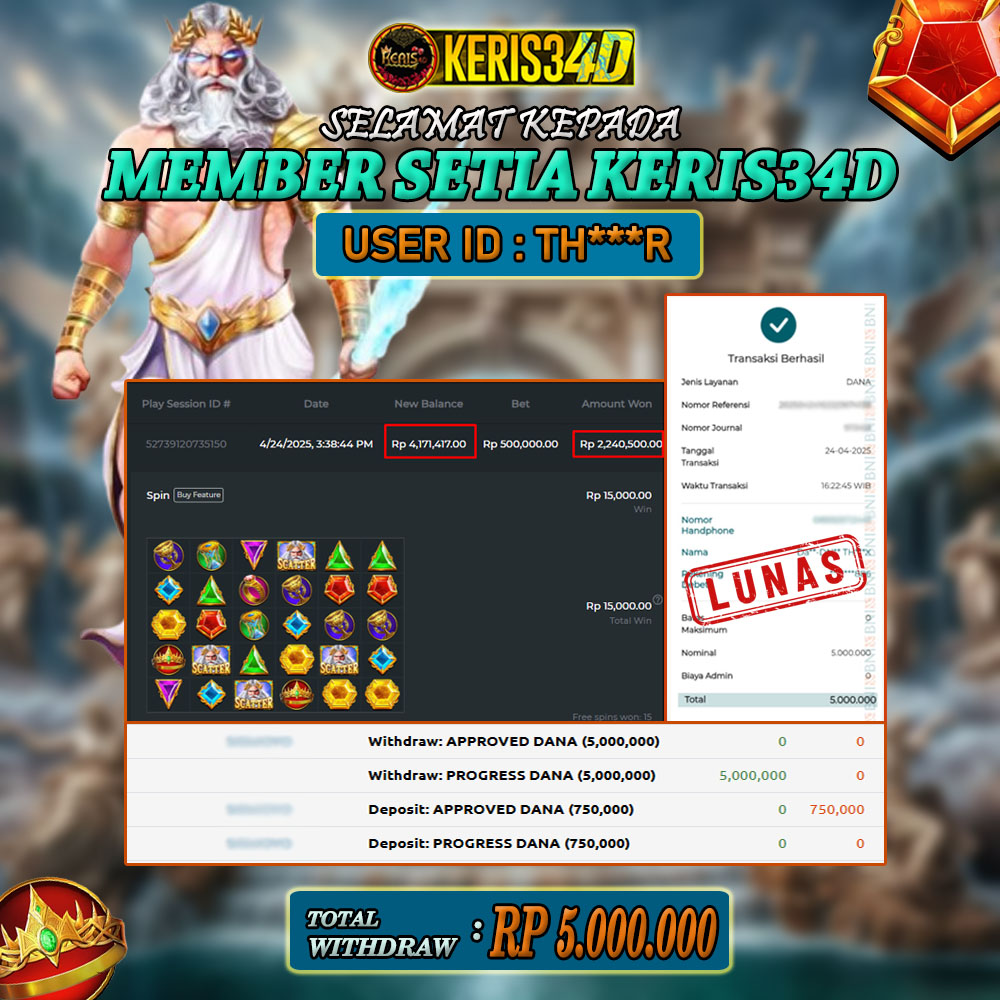 Setiap hari, member KERIS34D berhasil meraih jackpot besar dari berbagai provider slot ternama yang kami sediakan, seperti Pragmatic Play, Habanero, PG Soft, dan masih banyak lagi. Kami secara rutin menampilkan bukti screenshot atau rekapan kemenangan yang berhasil diraih, mulai dari kemenangan ratusan ribu hingga puluhan juta rupiah. Semua slip kemenangan ini kami hadirkan untuk membuktikan bahwa di KERIS34D, peluang menang itu nyata