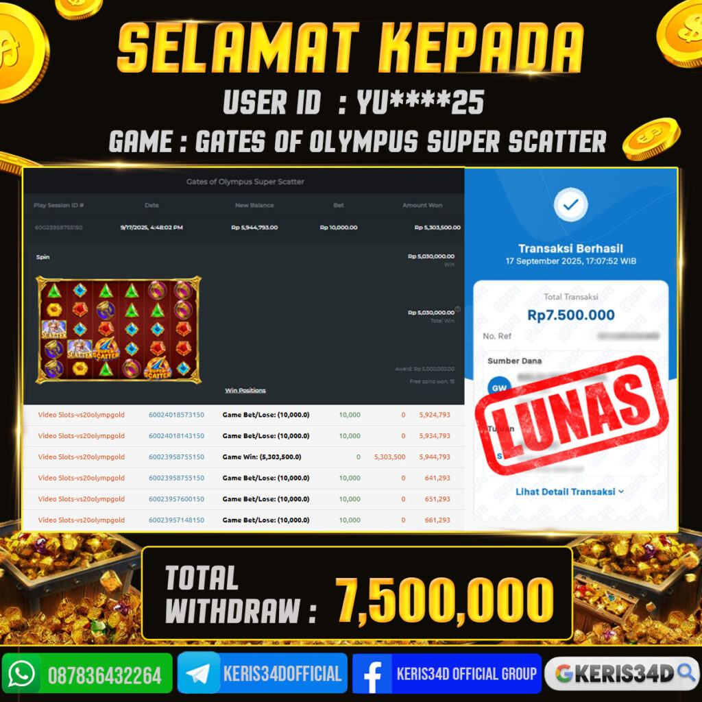 Setiap hari, member KERIS34D berhasil meraih jackpot besar dari berbagai provider slot ternama yang kami sediakan, seperti Pragmatic Play, Habanero, PG Soft, dan masih banyak lagi. Kami secara rutin menampilkan bukti screenshot atau rekapan kemenangan yang berhasil diraih, mulai dari kemenangan ratusan ribu hingga puluhan juta rupiah. Semua slip kemenangan ini kami hadirkan untuk membuktikan bahwa di KERIS34D, peluang menang itu nyata