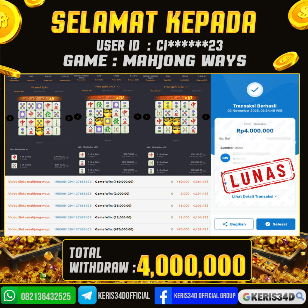 Setiap hari, member KERIS34D berhasil meraih jackpot besar dari berbagai provider slot ternama yang kami sediakan, seperti Pragmatic Play, Habanero, PG Soft, dan masih banyak lagi. Kami secara rutin menampilkan bukti screenshot atau rekapan kemenangan yang berhasil diraih, mulai dari kemenangan ratusan ribu hingga puluhan juta rupiah. Semua slip kemenangan ini kami hadirkan untuk membuktikan bahwa di KERIS34D, peluang menang itu nyata