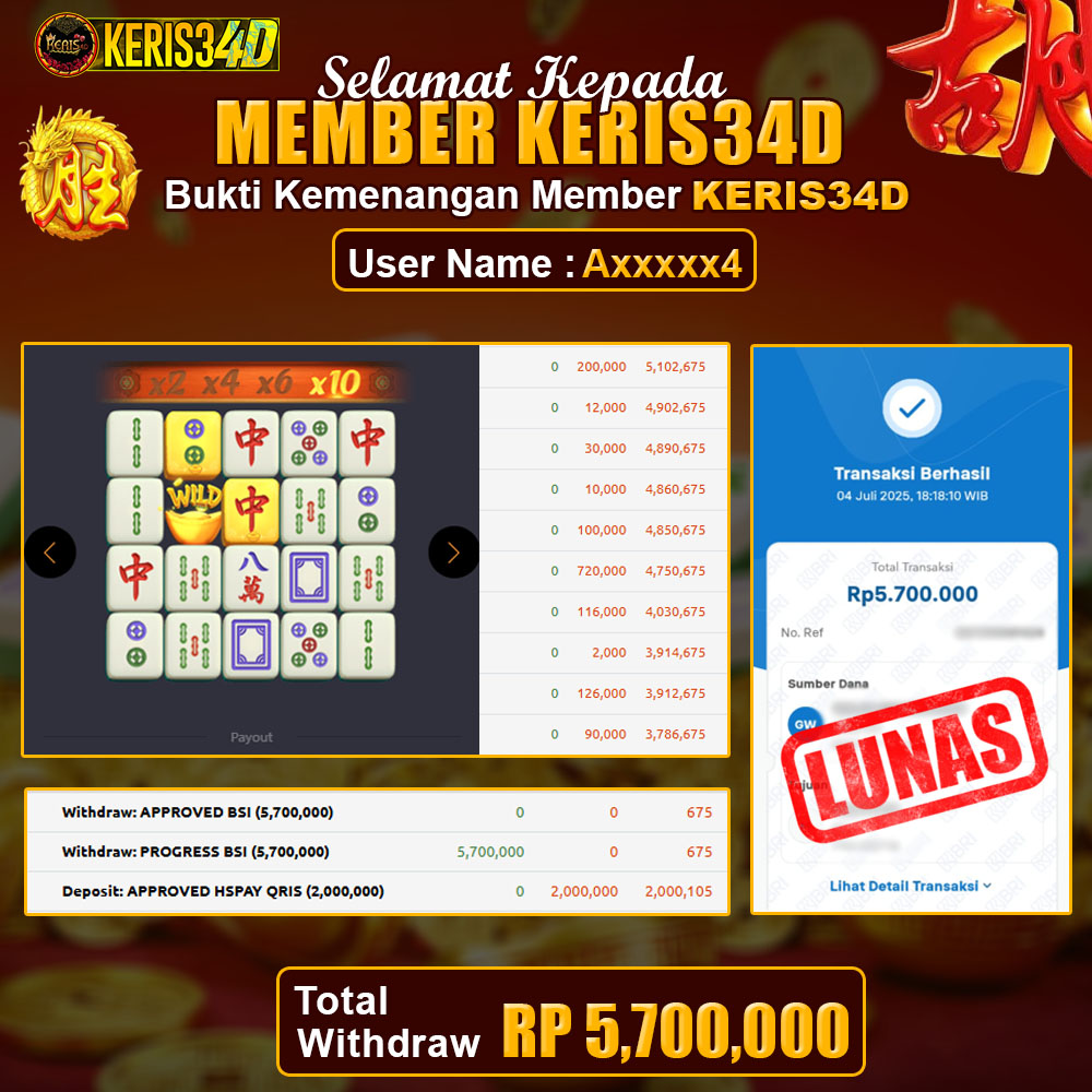 Setiap hari, member KERIS34D berhasil meraih jackpot besar dari berbagai provider slot ternama yang kami sediakan, seperti Pragmatic Play, Habanero, PG Soft, dan masih banyak lagi. Kami secara rutin menampilkan bukti screenshot atau rekapan kemenangan yang berhasil diraih, mulai dari kemenangan ratusan ribu hingga puluhan juta rupiah. Semua slip kemenangan ini kami hadirkan untuk membuktikan bahwa di KERIS34D, peluang menang itu nyata