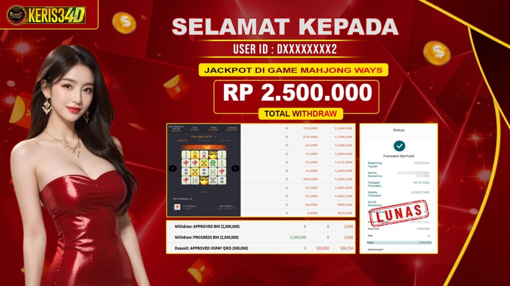 Setiap hari, member KERIS34D berhasil meraih jackpot besar dari berbagai provider slot ternama yang kami sediakan, seperti Pragmatic Play, Habanero, PG Soft, dan masih banyak lagi. Kami secara rutin menampilkan bukti screenshot atau rekapan kemenangan yang berhasil diraih, mulai dari kemenangan ratusan ribu hingga puluhan juta rupiah. Semua slip kemenangan ini kami hadirkan untuk membuktikan bahwa di KERIS34D, peluang menang itu nyata