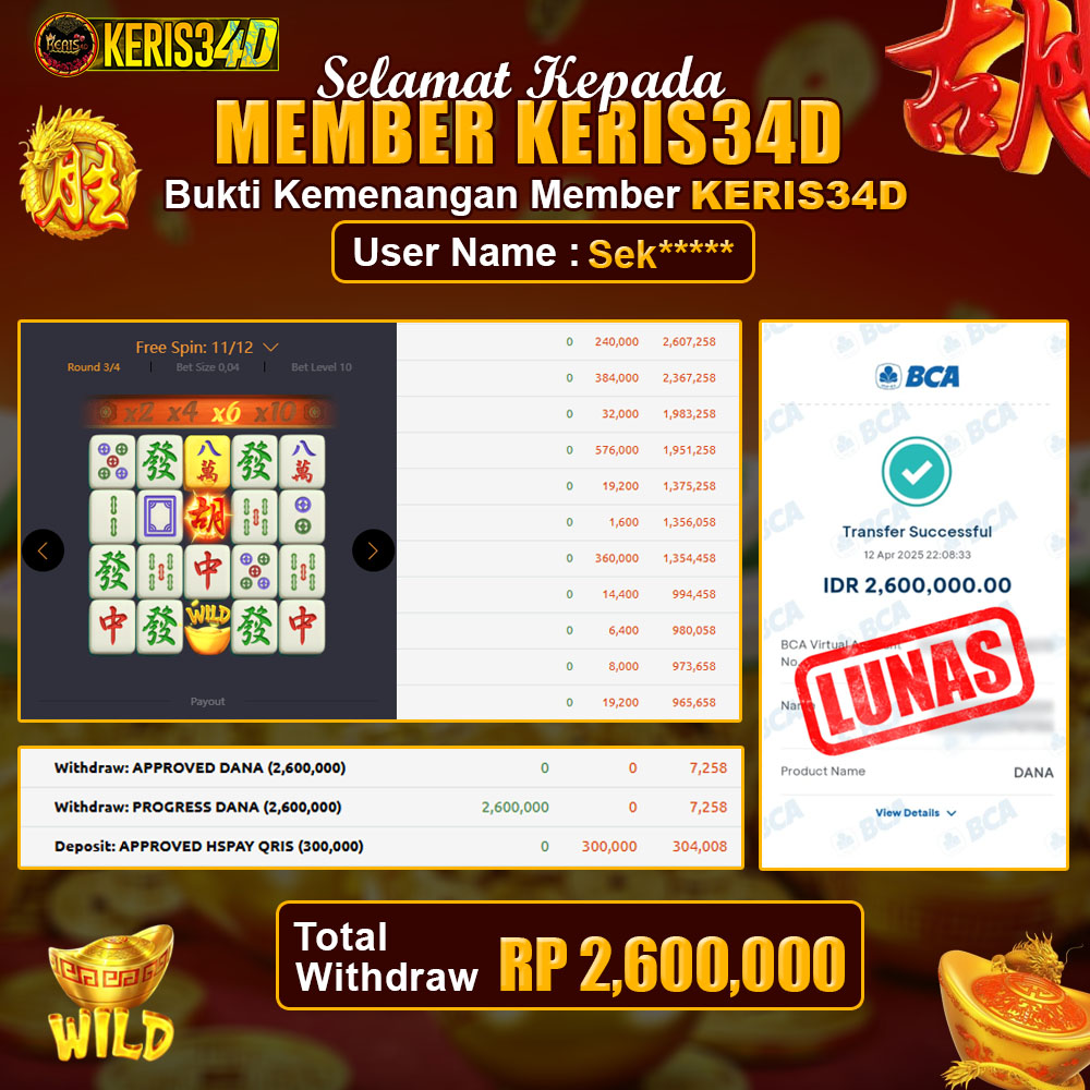 Setiap hari, member KERIS34D berhasil meraih jackpot besar dari berbagai provider slot ternama yang kami sediakan, seperti Pragmatic Play, Habanero, PG Soft, dan masih banyak lagi. Kami secara rutin menampilkan bukti screenshot atau rekapan kemenangan yang berhasil diraih, mulai dari kemenangan ratusan ribu hingga puluhan juta rupiah. Semua slip kemenangan ini kami hadirkan untuk membuktikan bahwa di KERIS34D, peluang menang itu nyata