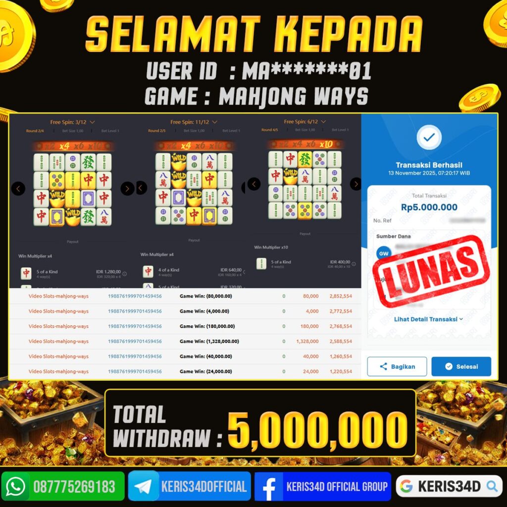 Setiap hari, member KERIS34D berhasil meraih jackpot besar dari berbagai provider slot ternama yang kami sediakan, seperti Pragmatic Play, Habanero, PG Soft, dan masih banyak lagi. Kami secara rutin menampilkan bukti screenshot atau rekapan kemenangan yang berhasil diraih, mulai dari kemenangan ratusan ribu hingga puluhan juta rupiah. Semua slip kemenangan ini kami hadirkan untuk membuktikan bahwa di KERIS34D, peluang menang itu nyata
