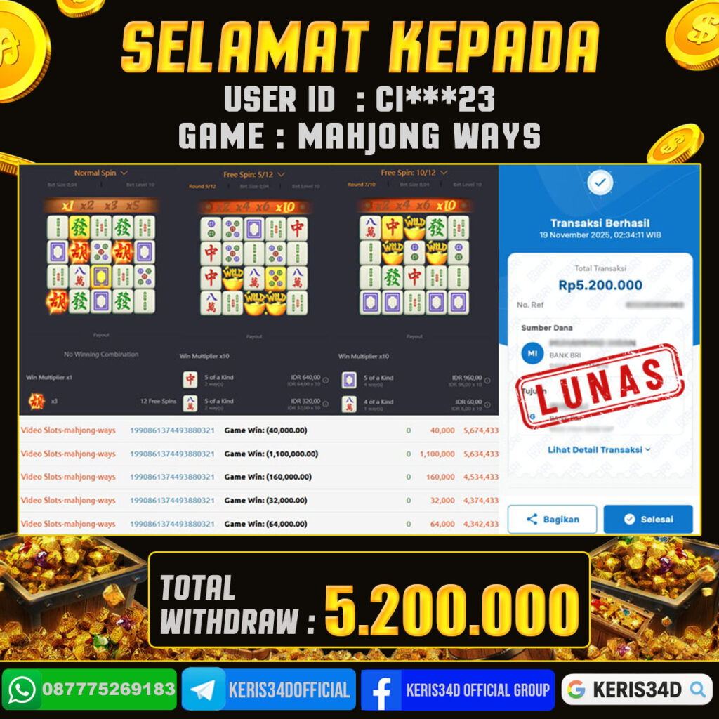 Setiap hari, member KERIS34D berhasil meraih jackpot besar dari berbagai provider slot ternama yang kami sediakan, seperti Pragmatic Play, Habanero, PG Soft, dan masih banyak lagi. Kami secara rutin menampilkan bukti screenshot atau rekapan kemenangan yang berhasil diraih, mulai dari kemenangan ratusan ribu hingga puluhan juta rupiah. Semua slip kemenangan ini kami hadirkan untuk membuktikan bahwa di KERIS34D, peluang menang itu nyata