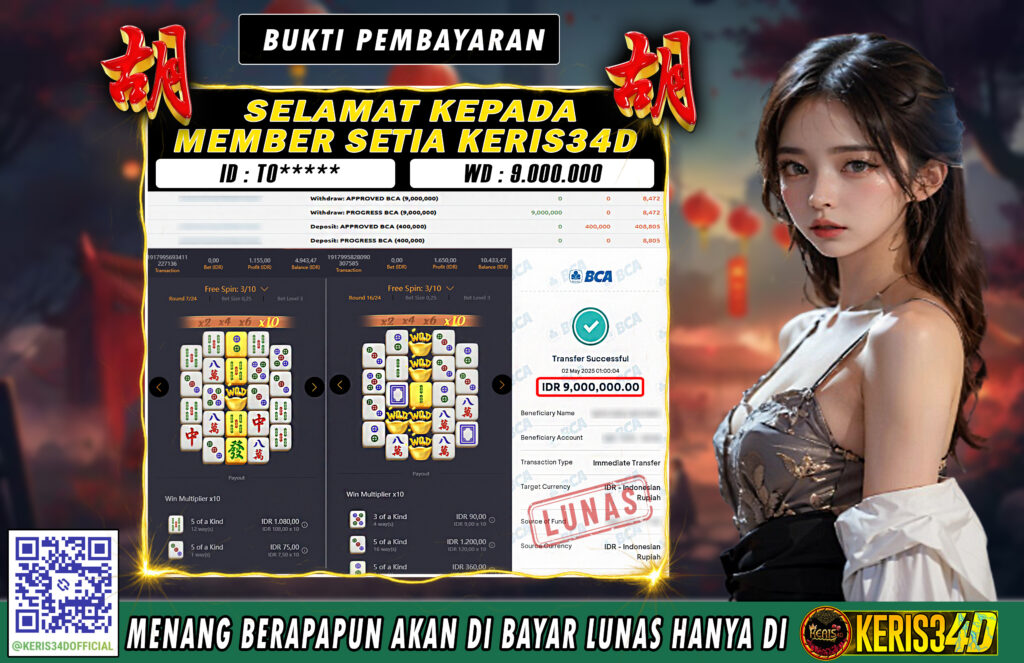 Setiap hari, member KERIS34D berhasil meraih jackpot besar dari berbagai provider slot ternama yang kami sediakan, seperti Pragmatic Play, Habanero, PG Soft, dan masih banyak lagi. Kami secara rutin menampilkan bukti screenshot atau rekapan kemenangan yang berhasil diraih, mulai dari kemenangan ratusan ribu hingga puluhan juta rupiah. Semua slip kemenangan ini kami hadirkan untuk membuktikan bahwa di KERIS34D, peluang menang itu nyata