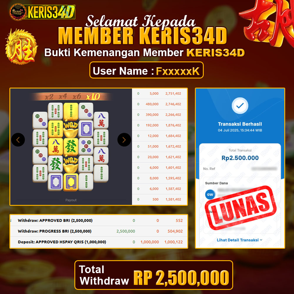 Setiap hari, member KERIS34D berhasil meraih jackpot besar dari berbagai provider slot ternama yang kami sediakan, seperti Pragmatic Play, Habanero, PG Soft, dan masih banyak lagi. Kami secara rutin menampilkan bukti screenshot atau rekapan kemenangan yang berhasil diraih, mulai dari kemenangan ratusan ribu hingga puluhan juta rupiah. Semua slip kemenangan ini kami hadirkan untuk membuktikan bahwa di KERIS34D, peluang menang itu nyata