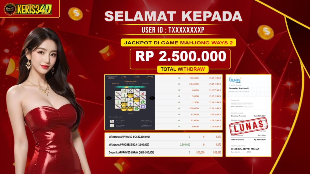 KERIS34D dikenal sebagai situs terpercaya yang selalu menghadirkan pengalaman bermain slot online yang aman, fair, dan berlisensi resmi. Di sini, kami tidak hanya sekadar memberikan janji, tapi bukti nyata berupa slip kemenangan yang dapat Anda lihat secara langsung.