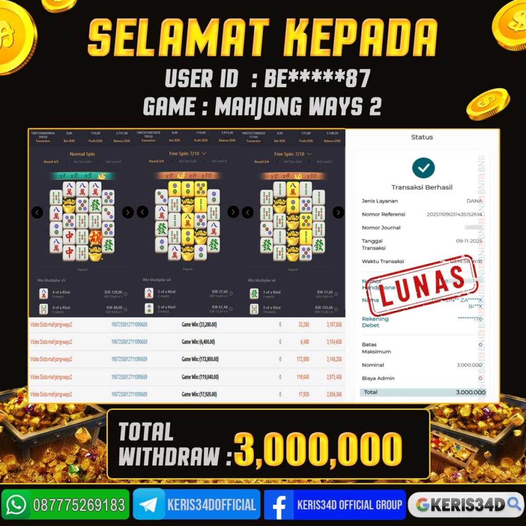 Setiap hari, member KERIS34D berhasil meraih jackpot besar dari berbagai provider slot ternama yang kami sediakan, seperti Pragmatic Play, Habanero, PG Soft, dan masih banyak lagi. Kami secara rutin menampilkan bukti screenshot atau rekapan kemenangan yang berhasil diraih, mulai dari kemenangan ratusan ribu hingga puluhan juta rupiah. Semua slip kemenangan ini kami hadirkan untuk membuktikan bahwa di KERIS34D, peluang menang itu nyata