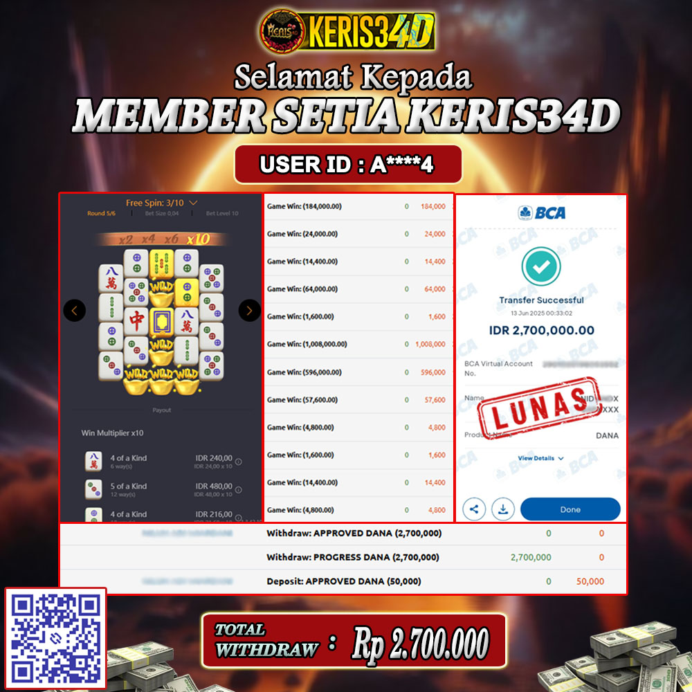 Setiap hari, member KERIS34D berhasil meraih jackpot besar dari berbagai provider slot ternama yang kami sediakan, seperti Pragmatic Play, Habanero, PG Soft, dan masih banyak lagi. Kami secara rutin menampilkan bukti screenshot atau rekapan kemenangan yang berhasil diraih, mulai dari kemenangan ratusan ribu hingga puluhan juta rupiah. Semua slip kemenangan ini kami hadirkan untuk membuktikan bahwa di KERIS34D, peluang menang itu nyata