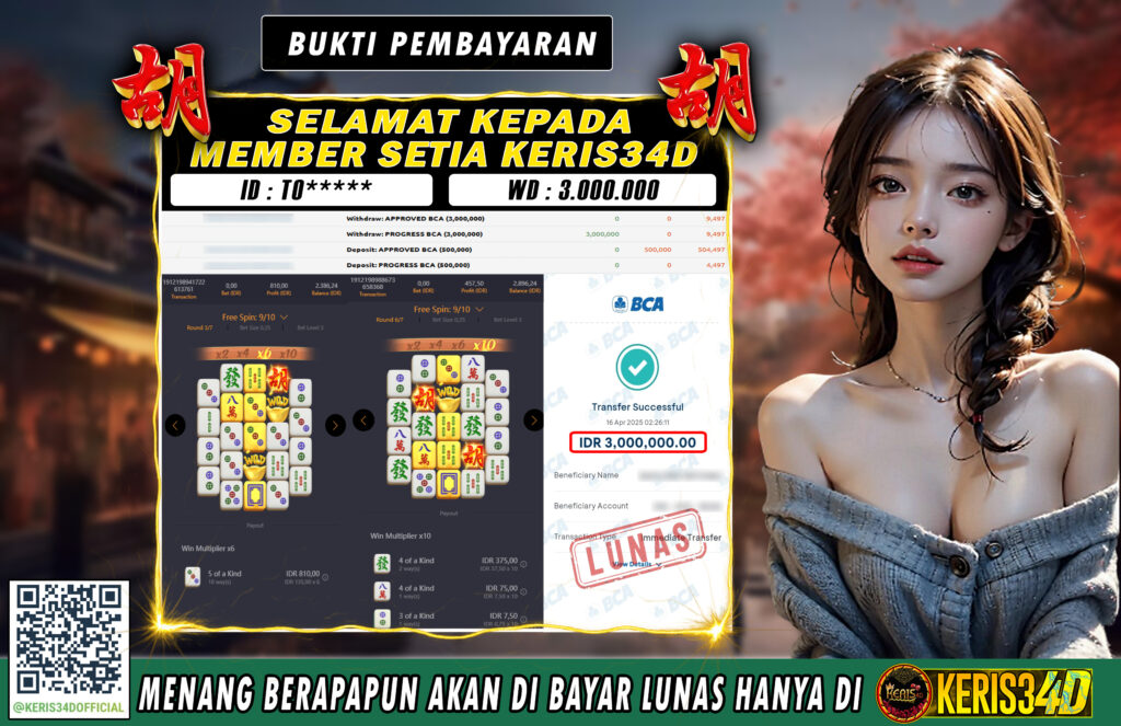 Setiap hari, member KERIS34D berhasil meraih jackpot besar dari berbagai provider slot ternama yang kami sediakan, seperti Pragmatic Play, Habanero, PG Soft, dan masih banyak lagi. Kami secara rutin menampilkan bukti screenshot atau rekapan kemenangan yang berhasil diraih, mulai dari kemenangan ratusan ribu hingga puluhan juta rupiah. Semua slip kemenangan ini kami hadirkan untuk membuktikan bahwa di KERIS34D, peluang menang itu nyata