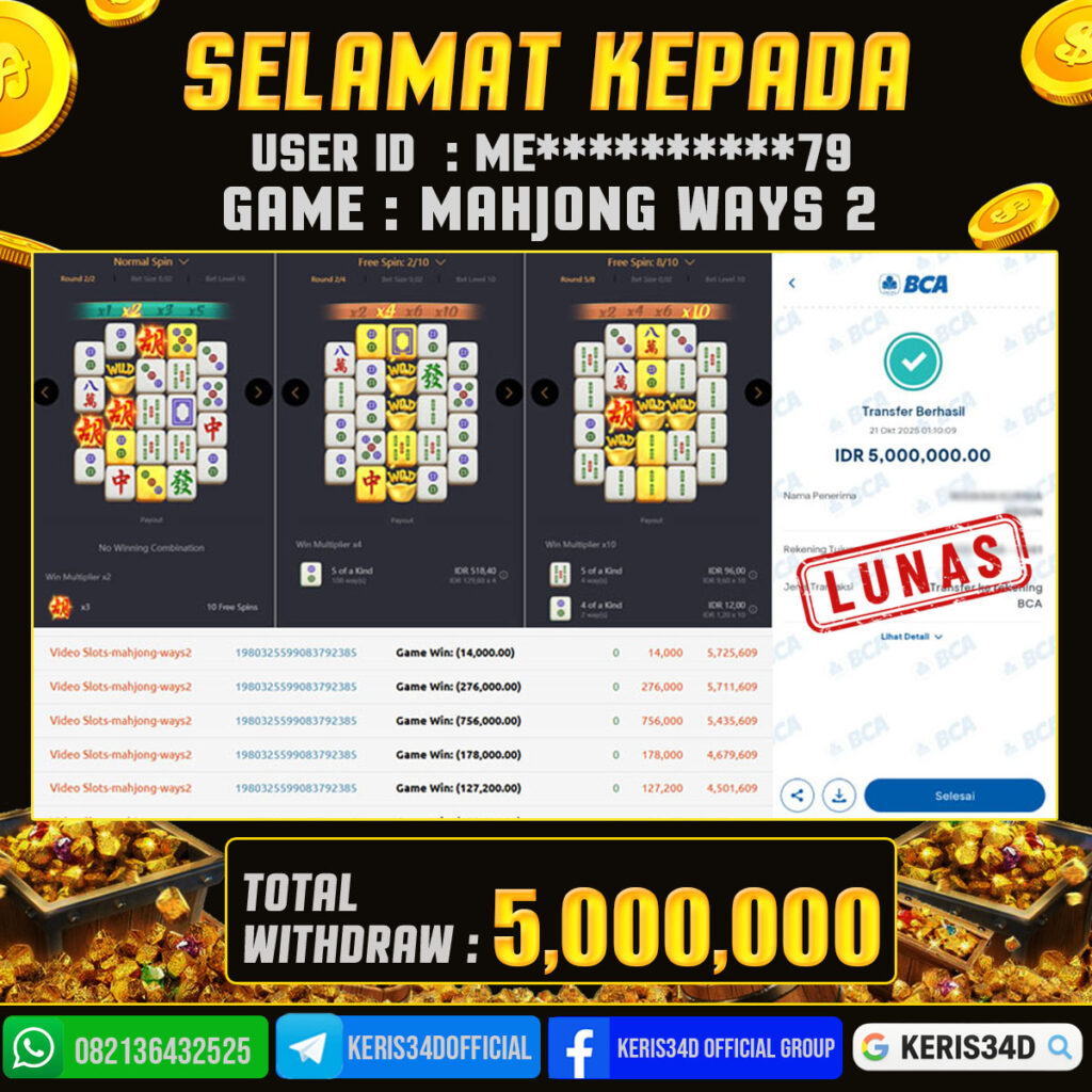 Setiap hari, member KERIS34D berhasil meraih jackpot besar dari berbagai provider slot ternama yang kami sediakan, seperti Pragmatic Play, Habanero, PG Soft, dan masih banyak lagi. Kami secara rutin menampilkan bukti screenshot atau rekapan kemenangan yang berhasil diraih, mulai dari kemenangan ratusan ribu hingga puluhan juta rupiah. Semua slip kemenangan ini kami hadirkan untuk membuktikan bahwa di KERIS34D, peluang menang itu nyata