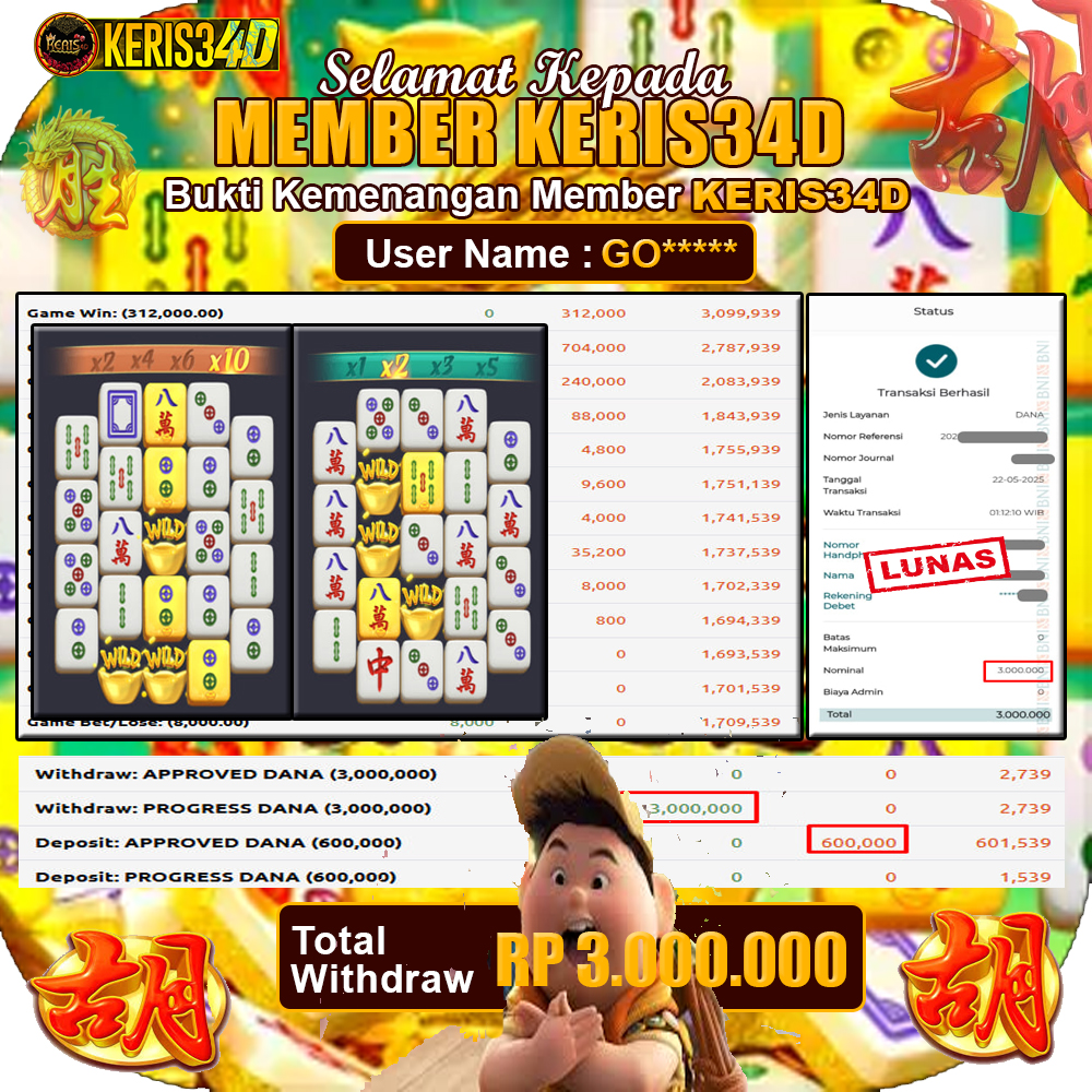 Setiap hari, member KERIS34D berhasil meraih jackpot besar dari berbagai provider slot ternama yang kami sediakan, seperti Pragmatic Play, Habanero, PG Soft, dan masih banyak lagi. Kami secara rutin menampilkan bukti screenshot atau rekapan kemenangan yang berhasil diraih, mulai dari kemenangan ratusan ribu hingga puluhan juta rupiah. Semua slip kemenangan ini kami hadirkan untuk membuktikan bahwa di KERIS34D, peluang menang itu nyata