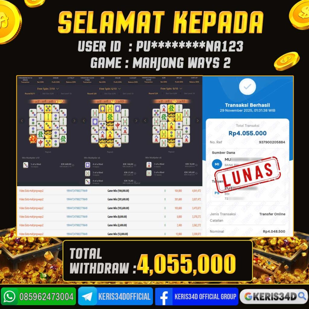Setiap hari, member KERIS34D berhasil meraih jackpot besar dari berbagai provider slot ternama yang kami sediakan, seperti Pragmatic Play, Habanero, PG Soft, dan masih banyak lagi. Kami secara rutin menampilkan bukti screenshot atau rekapan kemenangan yang berhasil diraih, mulai dari kemenangan ratusan ribu hingga puluhan juta rupiah. Semua slip kemenangan ini kami hadirkan untuk membuktikan bahwa di KERIS34D, peluang menang itu nyata