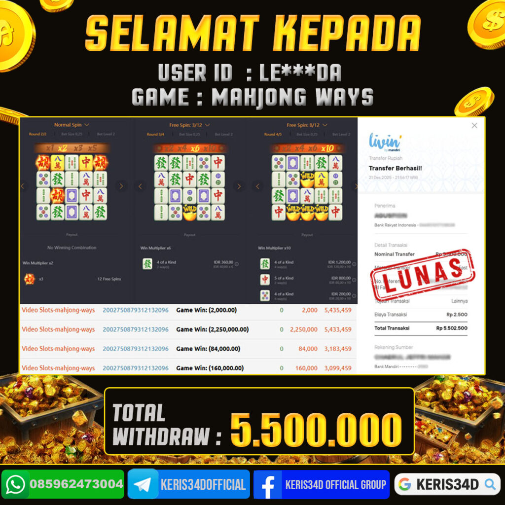 Setiap hari, member KERIS34D berhasil meraih jackpot besar dari berbagai provider slot ternama yang kami sediakan, seperti Pragmatic Play, Habanero, PG Soft, dan masih banyak lagi. Kami secara rutin menampilkan bukti screenshot atau rekapan kemenangan yang berhasil diraih, mulai dari kemenangan ratusan ribu hingga puluhan juta rupiah. Semua slip kemenangan ini kami hadirkan untuk membuktikan bahwa di KERIS34D, peluang menang itu nyata