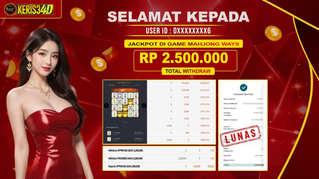 KERIS34D dikenal sebagai situs terpercaya yang selalu menghadirkan pengalaman bermain slot online yang aman, fair, dan berlisensi resmi. Di sini, kami tidak hanya sekadar memberikan janji, tapi bukti nyata berupa slip kemenangan yang dapat Anda lihat secara langsung.