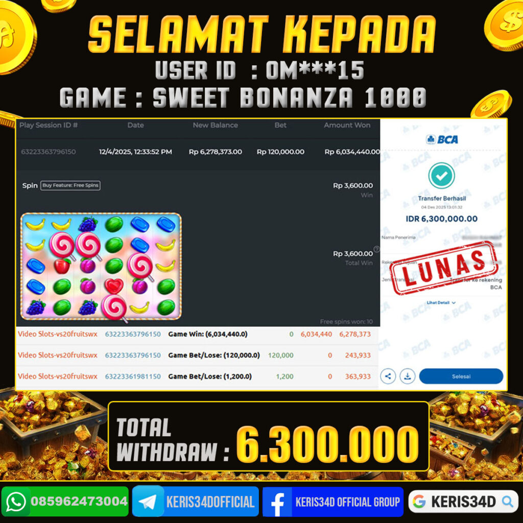 Setiap hari, member KERIS34D berhasil meraih jackpot besar dari berbagai provider slot ternama yang kami sediakan, seperti Pragmatic Play, Habanero, PG Soft, dan masih banyak lagi. Kami secara rutin menampilkan bukti screenshot atau rekapan kemenangan yang berhasil diraih, mulai dari kemenangan ratusan ribu hingga puluhan juta rupiah. Semua slip kemenangan ini kami hadirkan untuk membuktikan bahwa di KERIS34D, peluang menang itu nyata