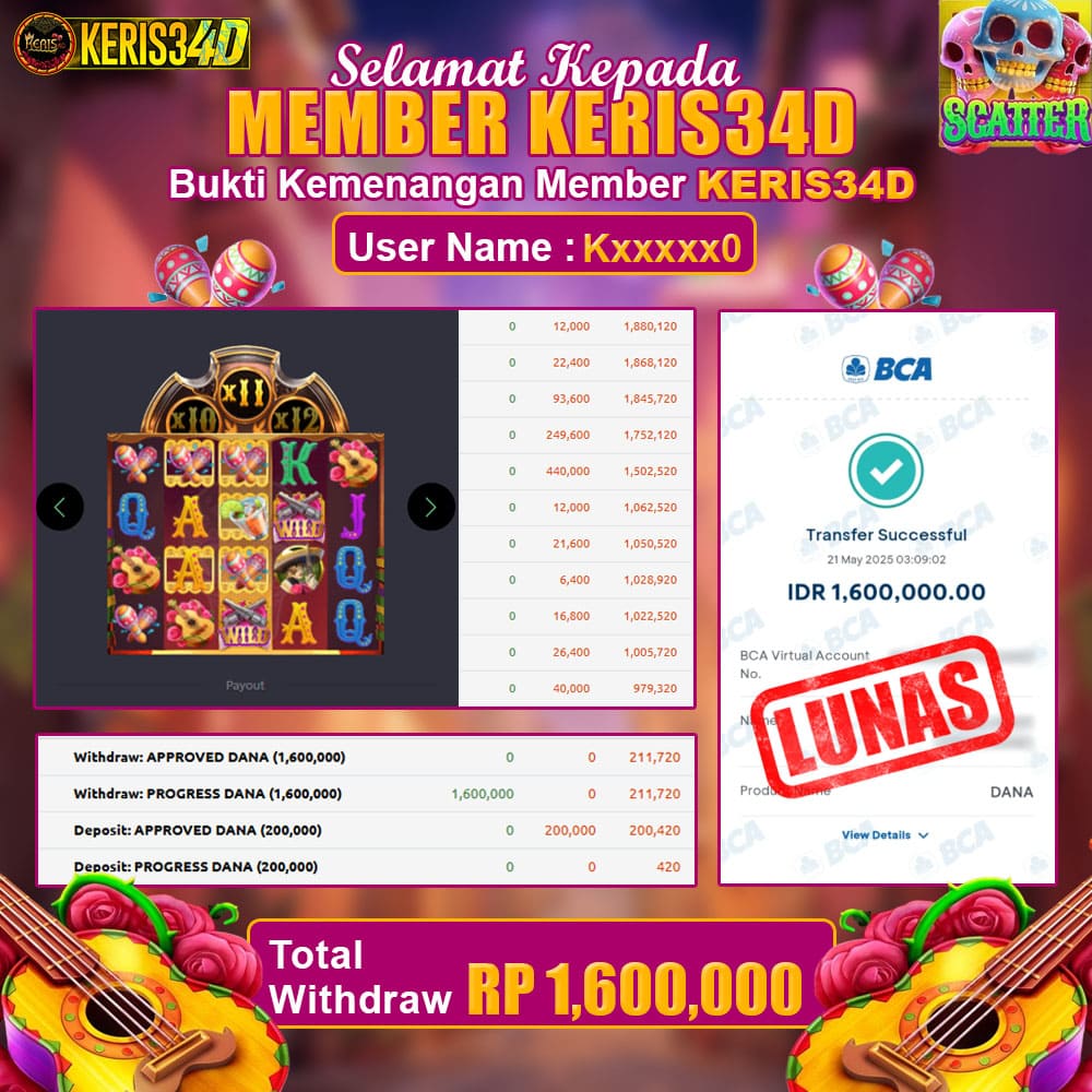 Setiap hari, member KERIS34D berhasil meraih jackpot besar dari berbagai provider slot ternama yang kami sediakan, seperti Pragmatic Play, Habanero, PG Soft, dan masih banyak lagi. Kami secara rutin menampilkan bukti screenshot atau rekapan kemenangan yang berhasil diraih, mulai dari kemenangan ratusan ribu hingga puluhan juta rupiah. Semua slip kemenangan ini kami hadirkan untuk membuktikan bahwa di KERIS34D, peluang menang itu nyata