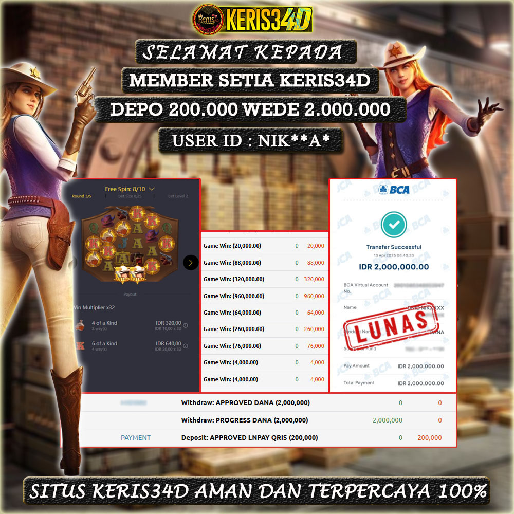 Setiap hari, member KERIS34D berhasil meraih jackpot besar dari berbagai provider slot ternama yang kami sediakan, seperti Pragmatic Play, Habanero, PG Soft, dan masih banyak lagi. Kami secara rutin menampilkan bukti screenshot atau rekapan kemenangan yang berhasil diraih, mulai dari kemenangan ratusan ribu hingga puluhan juta rupiah. Semua slip kemenangan ini kami hadirkan untuk membuktikan bahwa di KERIS34D, peluang menang itu nyata