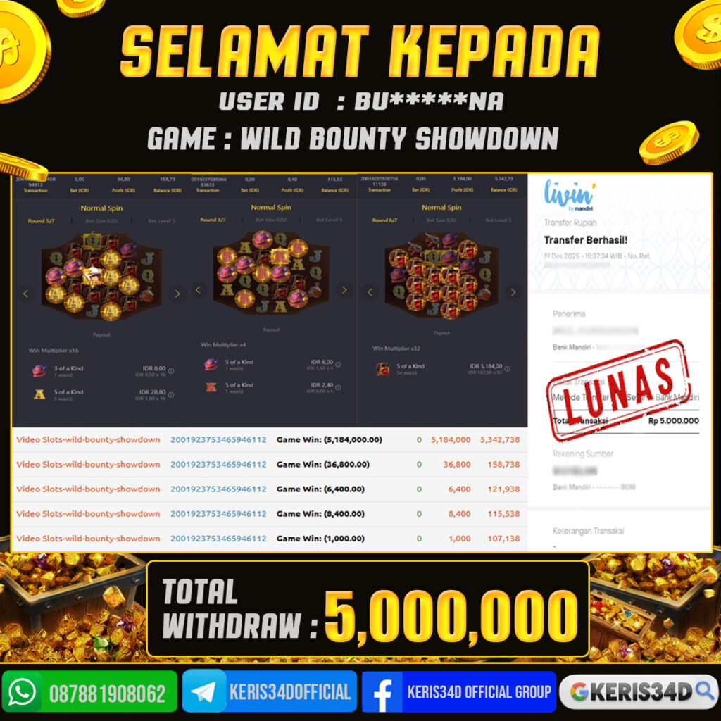 Setiap hari, member KERIS34D berhasil meraih jackpot besar dari berbagai provider slot ternama yang kami sediakan, seperti Pragmatic Play, Habanero, PG Soft, dan masih banyak lagi. Kami secara rutin menampilkan bukti screenshot atau rekapan kemenangan yang berhasil diraih, mulai dari kemenangan ratusan ribu hingga puluhan juta rupiah. Semua slip kemenangan ini kami hadirkan untuk membuktikan bahwa di KERIS34D, peluang menang itu nyata