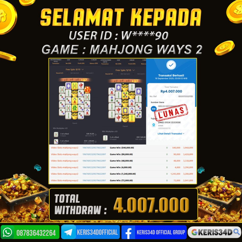 Setiap hari, member KERIS34D berhasil meraih jackpot besar dari berbagai provider slot ternama yang kami sediakan, seperti Pragmatic Play, Habanero, PG Soft, dan masih banyak lagi. Kami secara rutin menampilkan bukti screenshot atau rekapan kemenangan yang berhasil diraih, mulai dari kemenangan ratusan ribu hingga puluhan juta rupiah. Semua slip kemenangan ini kami hadirkan untuk membuktikan bahwa di KERIS34D, peluang menang itu nyata