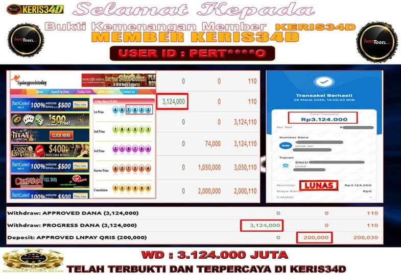 Setiap hari, member KERIS34D berhasil meraih jackpot besar dari berbagai provider slot ternama yang kami sediakan, seperti Pragmatic Play, Habanero, PG Soft, dan masih banyak lagi. Kami secara rutin menampilkan bukti screenshot atau rekapan kemenangan yang berhasil diraih, mulai dari kemenangan ratusan ribu hingga puluhan juta rupiah. Semua slip kemenangan ini kami hadirkan untuk membuktikan bahwa di KERIS34D, peluang menang itu nyata.